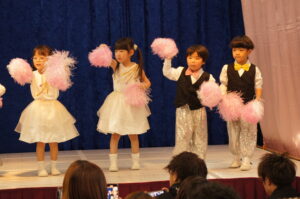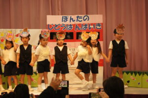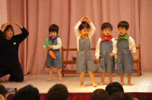 合奏・お遊戯・劇などお家の方に見てもらいたい思いで、日々発表会ごっこを楽しんできた子ども達。発表会当日は、一人ひとりが表現を楽しんだり、出来るようになったお遊戯などを披露する場となりました。自分の出たいお遊戯や劇の役を選び、演じる姿は輝いていました。舞台裏では緊張していた子も素敵な衣装姿をお家の方に見てもらえることが嬉しく、舞台上では堂々としていました。保護者の保護者の方々の温かく見守ってくれたおかげで、発表会は大成功でした。