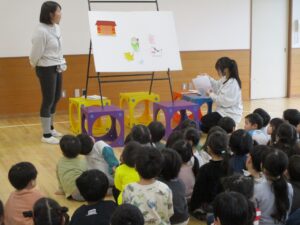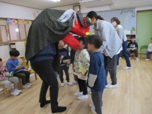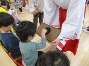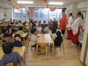 新年会がありました。園長先生が腹話術人形のたっちんを連れてきてくれ腹話術を楽しんだり、十二支のお話しのパネルシアターをみました。その後は各クラスに神主さんと巫女さんが来てくれ、今年一年みんな仲良く元気に過ごせますようにとお参りしたり、おみくじを引きました。お獅子も登場し、頭を噛まれると頭がよくなると知って「頭噛んでほしい」とお願いする子もいました。
